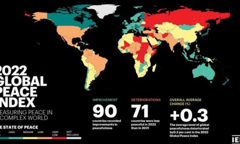 صدر معهد السلام والاقتصاد العالمي "مؤشر السلام العالمي لعام 2022" حيث جاءت قطر في المرتبة الأولى عربيًّا، بعد أن حلت في المرتبة 23 عالميًّا من بين 163 دولة. وقال التقرير إن منطقة الشرق الأوسط وشمال أفريقيا تبقى "الأقل" في مؤشر السلام في العالم للعام السابع على التوالي، رغم تحسن بعض المؤشرات بشكل طفيف. وكشفت نتائج المؤشر تحسن النتائج الإجمالية في 12 دولة من بين 20 دولة في المنطقة، فيما سجلت ثمانية دول تدهوراً في مؤشر السلام. وجاء اليمن في ذيل قائمة الدول، ليصبح الأقل بمؤشر السلام في الشرق الأوسط وحتى في العالم، ويحل مكان سوريا التي كانت في تلك المرتبة منذ 2014. وشهد السودان أكبر تدهور في مؤشر السلام في المنطقة، واحتل رابع أقل مرتبة بمؤشر السلام بعدما شهد تدهوراً في جميع المجالات، فيما تحسّنت المؤشرات في ليبيا بعد هدوء نسبي خلال الفترة الماضية، ولكنها تبقى من الدول الأقل على مؤشر السلام العالمي. وهذا ترتيب الدول العربية وفق "مؤشر السلام العالمي" لعام 2022: قطر: في المرتبة 1 عربيا، و23 عالميا الكويت: في المرتبة 2 عربيا، و39 عالميا الأردن: في المرتبة 3 عربيا، و57 عالميا الإمارات: في المرتبة 4 عربيا، و60 عالميا عُمان: في المرتبة 5 عربيا، و64 عالميا المغرب: في المرتبة 6 عربيا، و74 عالميا تونس: في المرتبة 7 عربيا، و85 عالميا البحرين: في المرتبة 8 عربيا، و99 عالميا الجزائر: في المرتبة 9 عربيا، و109 عالميا السعودية: في المرتبة 10 عربيا، و119 عالميا مصر: في المرتبة 11 عربيا، و126 عالميا الأراضي الفلسطينية: في المرتبة 12 عربيا، و133 عالميا لبنان: في المرتبة 13 عربيا، و138 عالميا ليبيا: في المرتبة 14 عربيا، و151 عالميا السودان: في المرتبة 15 عربيا، و154 عالميا العراق: في المرتبة 16 عربيا، و157 عالميا سوريا: في المرتبة 17 عربيا، و161 عالميا اليمن: في المرتبة 18 عربيا، و162 عالميا. وعالميا، تراجع مؤشر السلام العالمي إلى أدنى مستوى منذ 15 عاماً بسبب حالة عدم اليقين الاقتصادي بعد جائحة كورونا، والحرب الروسية على أوكرانيا. وأظهرت نتائج المؤشر أن الوفيات الناجمة عن الصراعات تدهورت بشكل حاد بسبب الغزو الروسي لأوكرانيا، فيما تحسّنت المؤشرات المتعلقة بالإرهاب، إذ لم تسجل 70 دولة أي هجمات خلال عام 2021، وهي أفضل نتيجة منذ عام 2008. وحذر التقرير من انعدام الأمن الغذائي، وعدم الاستقرار السياسي على مستوى العالم، إذ تتعرض أفريقيا وجنوب آسيا والشرق الأوسط لأكبر تهديد. وقدر التقرير الأثر الاقتصادي للعنف في 2021 بـ 16.5 تريليون دولار، ما يعادل 11 في المئة من الناتج المحلي الإجمالي العالمي، أو ما يعادل 2117 دولار على مستوى الفرد. وجاءت أيسلندا في المرتبة الأولى عالميًّا بمؤشر السلام تليها نيوزلندا وإيرلندا، فيما تذيلت كل من أفغانستان واليمن وسوريا وروسيا القائمة.