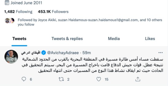 كشف الجيش الإسرائيلي عن سقوط طائرة موجهة عن بعد من طراز (RTV) في الفضاء البحري بالقرب من الحدود الشمالية.