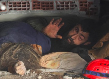يرقد عبد العليم المعيني تحت الأنقاض بجوار جثة زوجته إسراء في أعقاب الزلزال المدمر في هاتاي بتركيا في ٨ شباط/ فبراير.( الصورة لرويترز/ أوميت بكتاس).