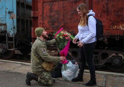 يتقدم الجندي الأوكراني فولوديمير لخطبة صديقته فيكتوريا أثناء قدومها لزيارته في محطة القطار في كراماتورسك بأوكرانيا. تصوير: يان دوربرونوسوف - رويترز