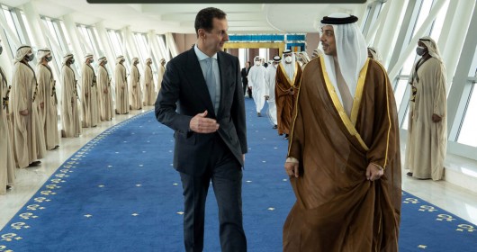 وصل رئيس النظام السوري، بشار الأسد إلى الإمارات، في زيارة رسمية برفقة زوجته،بعد يومين من زيارة أخرى أجراها الأسد لموسكو، والتقى خلالها الرئيس الروسي فلاديمير بوتين، وهي ثاني زيارة للأسد لدولة عربية عقب الزلزال المدمر، الذي وقع في فبراير/شباط الماضي. وكان رئيس الإمارات محمد بن زايد في مقدمة مستقبلي بشار الأسد لدى وصوله مطار الرئاسة في أبوظبي، بحسب وكالة أنباء الإمارات.  وأوضحت الوكالة الإماراتية أن الوفد المرافق  لبشار الأسد يضم كلاً من وزير الاقتصاد والتجارة الخارجية سامر الخليل، ووزير شؤون رئاسة الجمهورية منصور عزام، ووزير الإعلام بطرس حلاق، ومعاون وزير الخارجية أيمن سوسان، والقائم بأعمال سفارة سوريا لدى الإمارات غسان عباس. جاءت زيارة بشار الأسد بعد أسابيع من زيارته لسلطنة عُمان، الإثنين 20 فبراير/شباط 2023، التقى خلالها السلطانَ هيثم بن طارق، في ثاني زيارة له لدولة عربية منذ اندلاع انتفاضة شعبية ضده منذ 12 عاماً، وذلك وفق ما نقلته وكالة رويترز للأنباء نقلاً عن إعلام النظام السوري. كان الأسد قد زار الإمارات العربية المتحدة، في أول زيارة خارجية إلى دولة عربية، في مارس/آذار 2022. وفي وقت سابق، قال مسؤولون عرب وأوروبيون، إن الدول العربية التي نبذت رئيس النظام السوري بشار الأسد مدةً طويلة، عرضت عليه صفقة من شأنها إعادة العلاقات بين دمشق وكثير من دول الشرق الأوسط، وكبح نفوذ إيران في الوقت نفسه، بحسب ما كشفت عنه صحيفة The Wall Street Journal الأمريكية، نقلاً عن مصادر. وكشفت المصادر أن الأردن قاد المحادثات في البداية، وعرضت الدول العربية خلالها مساعدات بمليارات الدولارات، لمعاونة النظام السوري في إعادة بناء البلاد المدمَّرة بعد الحرب الأهلية، وتعهدت بالضغط على الولايات المتحدة والقوى الأوروبية لرفع العقوبات عن نظام الأسد.  وقال المسؤولون إن عرض الدول العربية جاء في مقابل موافقة الأسد على التعاون مع المعارضة السياسية السورية، والقبول بقوات عربية لحماية اللاجئين العائدين، ومكافحة تهريب المخدرات، وأن يطلب من إيران التوقف عن توسيع حضورها في البلاد. وأوضح مستشار للنظام السوري ومسؤولون عرب وأوروبيون مطلعون- وفق وول ستريت جورنال- أن المحادثات لا تزال في "مرحلة مبكرة"، وأن الأسد لم يُظهر اهتماماً بمطلب الإصلاح السياسي، ولا استعداداً لاستقبال قوات عربية. في سياق موازٍ، وفي 12 فبراير/شباط 2023، أجرى وزير الخارجية الإماراتي الشيخ عبد الله بن زايد، زيارةً إلى دمشق، التقى خلالها بشار الأسد، في أعقاب الزلزال الذي ضرب سوريا. أعقب ذلك زيارة لوزير الخارجية الأردني أيمن الصفدي، وسط تردُّد أنباء عن زيارة قريبة لوزير الخارجية السعودي فيصل بن فرحان، للعاصمة السورية خلال الأيام المقبلة. يُذكر أن عدة دول عربية أرسلت قوافل مساعدات إنسانية إلى سوريا، بعد الزلزال المدمر الذي ضرب البلاد، منها مصر والجزائر والإمارات والسعودية والبحرين وقطر والعراق، فيما أعربت دول أخرى عن تضامنها.  ذكرت صحيفة "نيويورك تايمز" (The New York Times)، في  تقرير لها، أن رئيس النظام السوري بشار الأسد، يحاول استغلال الزلزال الذي ضرب مناطق واسعة في البلاد، للعودة إلى الساحة الدولية وكسر المقاطعة التي فُرضت عليه، بسبب ما جرى في سوريا بعد اندلاع ثورة 2011. أضاف التقرير أن بعض القادة العرب الذين نبذوا بشار الأسد لسنوات، بدأوا التواصل معه لبحث المساعدات، مثلما تواصلت معه قيادات أممية للسبب نفسه، والتُقطت صور له برفقة مسؤولين عرب.  نقلت الصحيفة عن إيميل هوكايم، محلل شؤون الشرق الأوسط في المعهد الدولي للدراسات الاستراتيجية بلندن، قوله إن الزلزال كان "نعمة" لبشار الأسد يحاول التشبث بها، لأنه "لا أحد يريد إدارة هذه الفوضى".