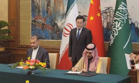 قال بيان مشترك وقعته السعودية وإيران إن البلدين سيعيدان فتح الممثليات الدبلوماسية خلال فترة الشهرين المنصوص عليها في اتفاق بكين.