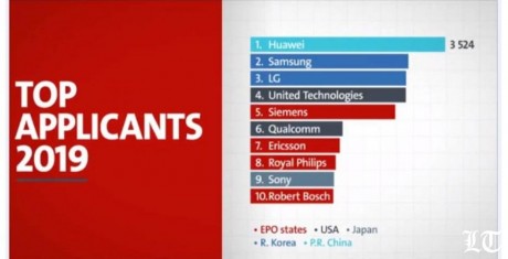 وقدمت شركة هواوي 3,524براءة اختراع، متخطية بذلك العديد من الشركات الكبرى في مجال التكنولوجيا. وأشار التقرير إلى أن الشركات الأمريكية والصينية والأوروبية ساهمت بنحو ربع عدد تطبيقات الاتصالات الرقمية. وارتفعت الطلبات المقدمة من الشركات الصينية بنحو ستة أضعاف تقريباً منذ عام 2010.