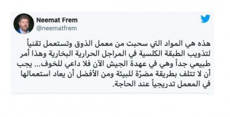 علّق قائلا: "هذه هي المواد التي سحبت من معمل الذوق وتستعمل تقنياً لتذويب الطبقة الكلسية في المراجل الحرارية البخارية وهذا أمر طبيعي جداً وهي في عهدة الجيش الآن فلا داعي للخوف... يجب أن لا تتلف بطريقة مضرّة للبيئة ومن الأفضل أن يعاد استعمالها في المعمل تدريجياً عند الحاجة."