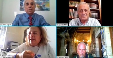 إِلى الأَعلى من اليسار: هنري زغيب يدير الندوة، سهيل منيمنة، أَنطوان لحود، أُسامة كلَّاب