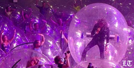 واعتمدت لتأمين التباعد الاجتماعي طريقة تغليف أعضاء الفرقة والجمهور بفقاعات بلاستيكية عملاقة.