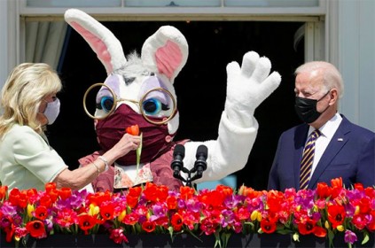 يقف الرئيس الأمريكي جو بايدن لإلقاء ملاحظاته حول تقليد عيد الفصح ، بجانب السيدة الأولى جيل بايدن وهي تحمل زهرة وشخص يرتدي زي أرنب عيد الفصح في شرفة الغرفة الزرقاء بالبيت الأبيض في واشنطن. تصوير: كيفين لامارك - رويترز