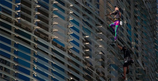 تسلق المغامر المعروف باسم "الرجل العنكبوت الفرنسي"، ألان روبير، واحدة من أعلى ناطحات السحاب في برشلونة.