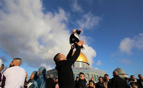 احتفل فلسطيني أثناء لعبه مع طفل بعد صلاة عيد الفطر في المجمع الذي يضم المسجد الأقصى في القدس ( رويترز / جمال عوض). وأدى المسلمون صلاة عيد الفطر في المسجد الحرام في مدينة مكة المكرمة ، المملكة العربية السعودية .(وكالة الأنباء السعودية ) أظهرت امرأة مسلمة يدها مرسومة بالحناء خلال عيد الفطر في ضاحية لاكيمبا في سيدني ، أستراليا، وعادة التزين بالحناء معروفة في عدد من المجتمعات الاسلامية في مصر والجزيرة العربية وافريقيا وشبه القارة الهندية. والحناء صبغة محضرة من نبات القناوية، المعروف أيضًا باسم شجرة الحناء، وشجرة Mignonette. والحناء فن نقش الجسد بتلطيخ الجلد من الأصباغ التي تزول تدريجيا.