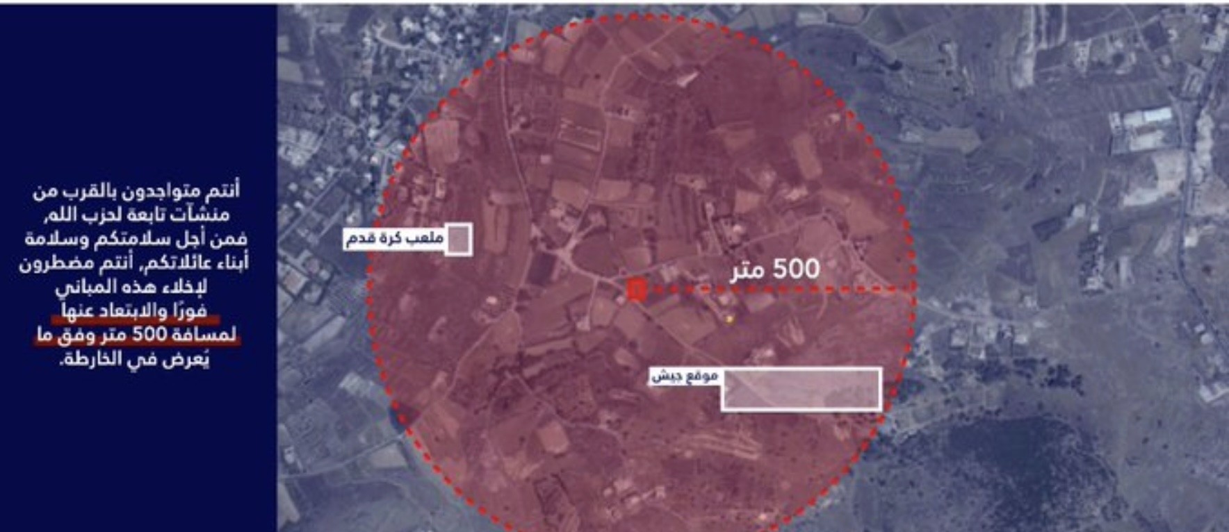 وأردف: “نتوجه إلى سكان المبنى المحدد بالأحمر في الخريطة المرفقة والمباني المجاورة له: أنتم تتواجدون بالقرب من مبنى يستخدمه حزب الله فمن أجل سلامتكم أنتم مضطرون لإخلائه.