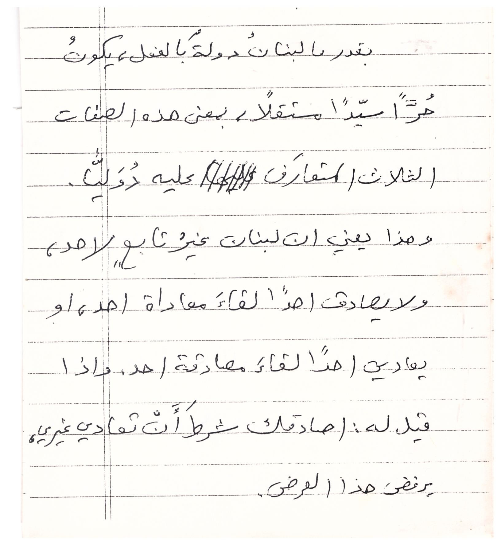 جوزف أبي ضاهر- تحت هذا «الشعارالحقيقي» حاضر الدكتور شارل مالك في جامعة الروح القدس ـ الكسليك (منذ 36 سنة) وحدّد: «لبنان دولة ومجتمعًا ومجموعة انتماءات دينيّة وثقافيّة». ...«وبقدر ما لبنان دولة بالفعل يكون حرًّا سيّدًا مستقلاً... بمعنى هذه الصفات الثلاث المتعارف عليها دوليًا. وهذا يعني أن لبنان غير تابع لأحد (...) وإذا قيل له: «أصادقك شرط أن تعادي غيري يرفض العرض». «لبنان ليس دولة فحسب، بل ليس دولة حتى في الدرجة الأولى... لبنان مجتمع معيّن، وخصائص هذا المجتمع كثيرة تجعل منه دولة مميّزة في جميع المجالات العلميّة والمهنيّة: هو حرّ، منفتح، ديمقراطي، تعدّدي... وهذه الميزات ـ بالذات ـ لا تسعها العين الضيّقة، وتريد محوها من الوجود». ... واستشهد مالك في محاضرته بخطاب مهمٍّ، ألقاه وزير خارجيّة أميركا في (شيكاغو ـ نوّار 1982) جاء فيه حرفيًّا: «حان الوقت لاتخاذ اجراءات مشتركة ومنسّقة، ليس فقط لتأييد سلامة لبنان الاقليميّة، داخل حدوده المعترف بها دوليًّا، بل أيضًا لدعم حكومة مركزيّة قويّة فيه، قادرة على تعزيز مجتمع حرٍّ، منفتح، ديمقراطي، وتعدّدي، بحسب تقاليده التي يعرفها العالم كلّه». والآن، هل تغيّر المشهد؟ لم يتغيّر.. بل زاد تعقيدًا، فالذين ينظرون إلى الخارج، ويأتمرون بالخارج وبغايات أطماعه، لا يدركون، بحسب الدكتور مالك: «أن الحرّية المسؤولة والإنسان اللبناني هما كلّ شيء، ومن يقدّرهما، ويعزّزهما في شخصه ومواقفه، يعيش حرًّا مرفوع الرأس والكرامة، ومن يخالفهما يهمله التاريخ، وينسى أنه كان موجودًا». من يعرف ذلك يعرف ويعترف، ومن لا يريد، سيظل رأسه تحت رمال الصحراء التي لا تنبت زهرًا، بل شوكًا. كلام الصور:ـ الدكتور مالك محاضرًا. ـ نص من المحاضرة بخط يده.