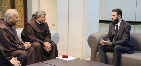 كلام الصورة:لقاء  نائب حارس الأرض المقدّسة الأب إبراهيم فلتس الفرنسيسكاني في دمشق مع أحمد الشرع.